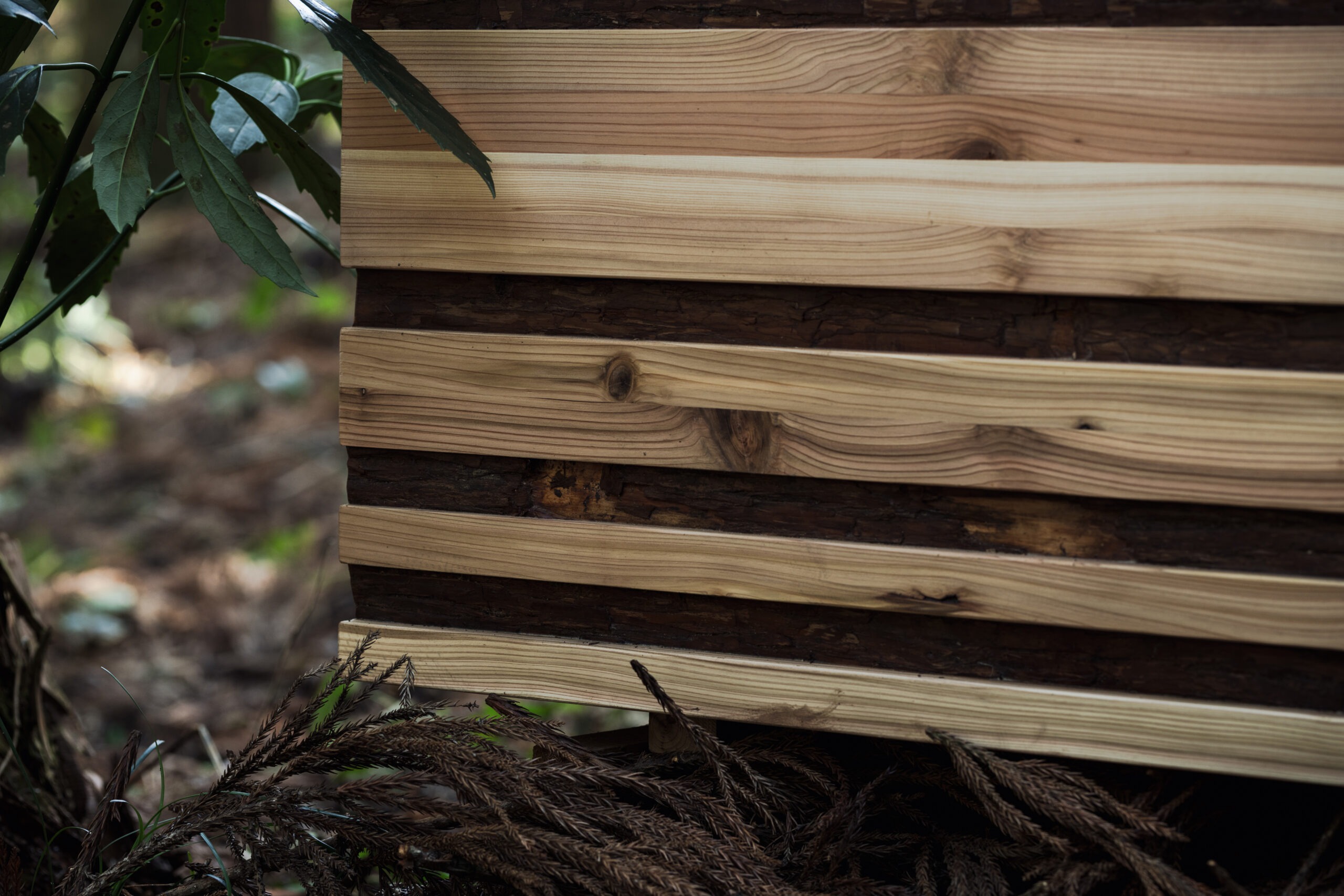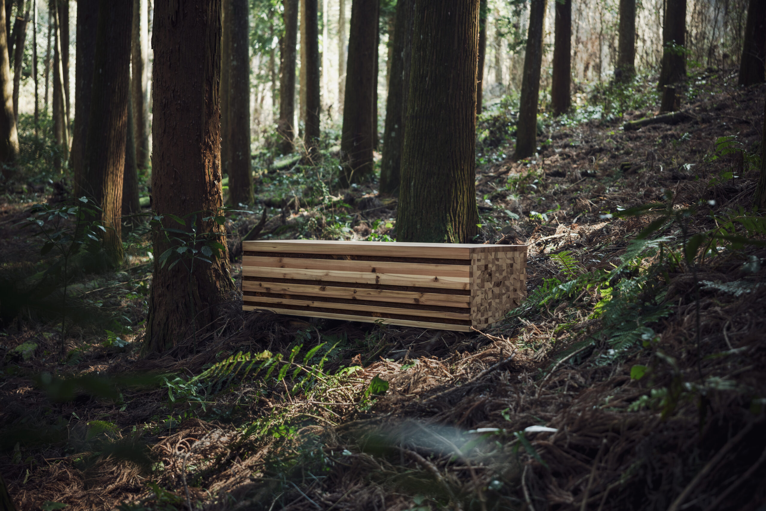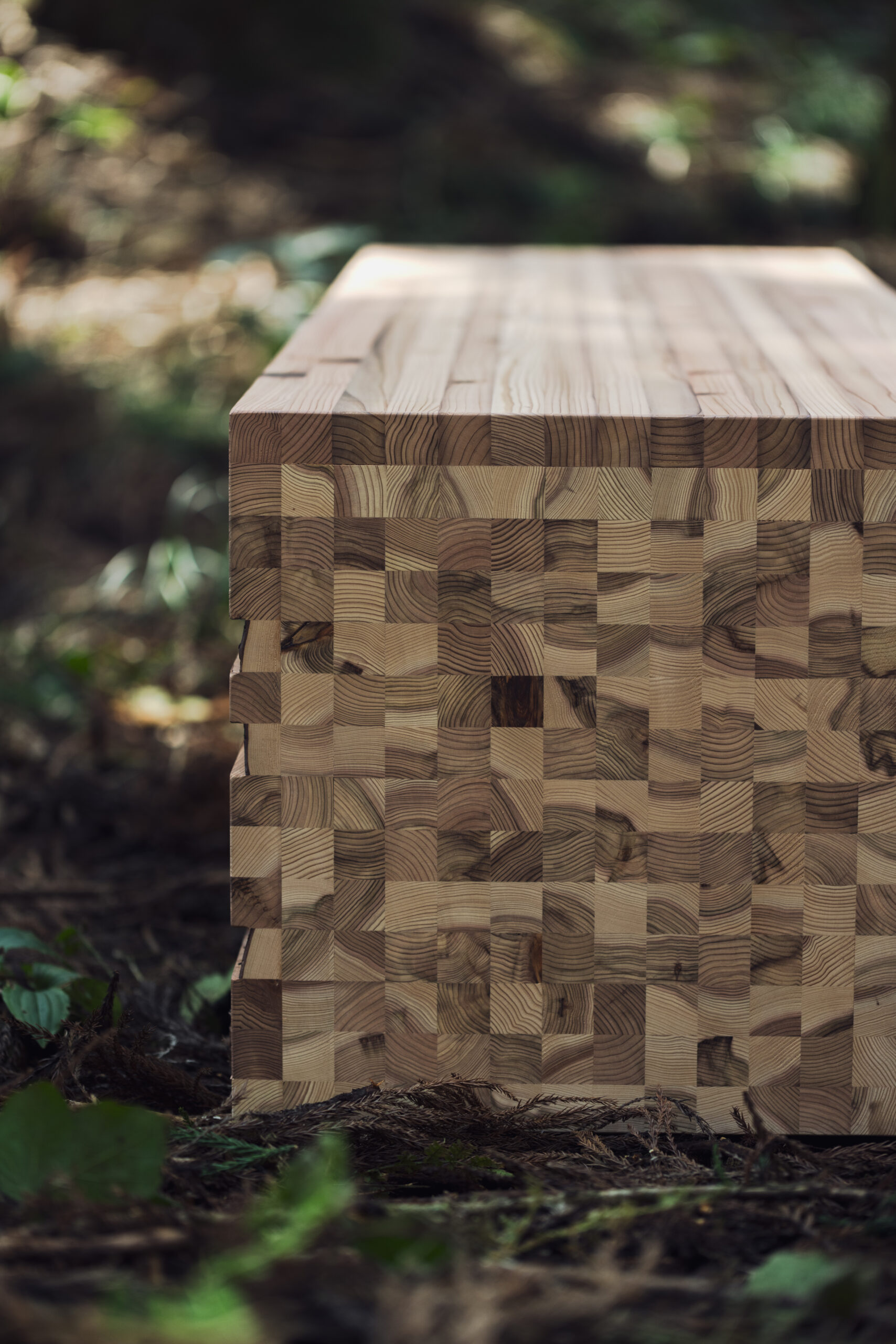 <均一ではない木材に、新たな可能性を> シミや節が多い「C 材」、そして利用されることなく伐採されたまま林地に残される「D 材」。その個性を魅力と捉え、C/D 材を細分化し、シミや節、色合いなどの個性を活かすようにひとつひとつ組み上げたベンチです。 このベンチは「2025年大阪・関西万博」静けさの森にて展示され、多くの方にご覧いただきました。閉幕後は、エイチ・ツー・オー リテイリング株式会社のオフィスをはじめ、国内の病院や公園へと受け継がれています。
